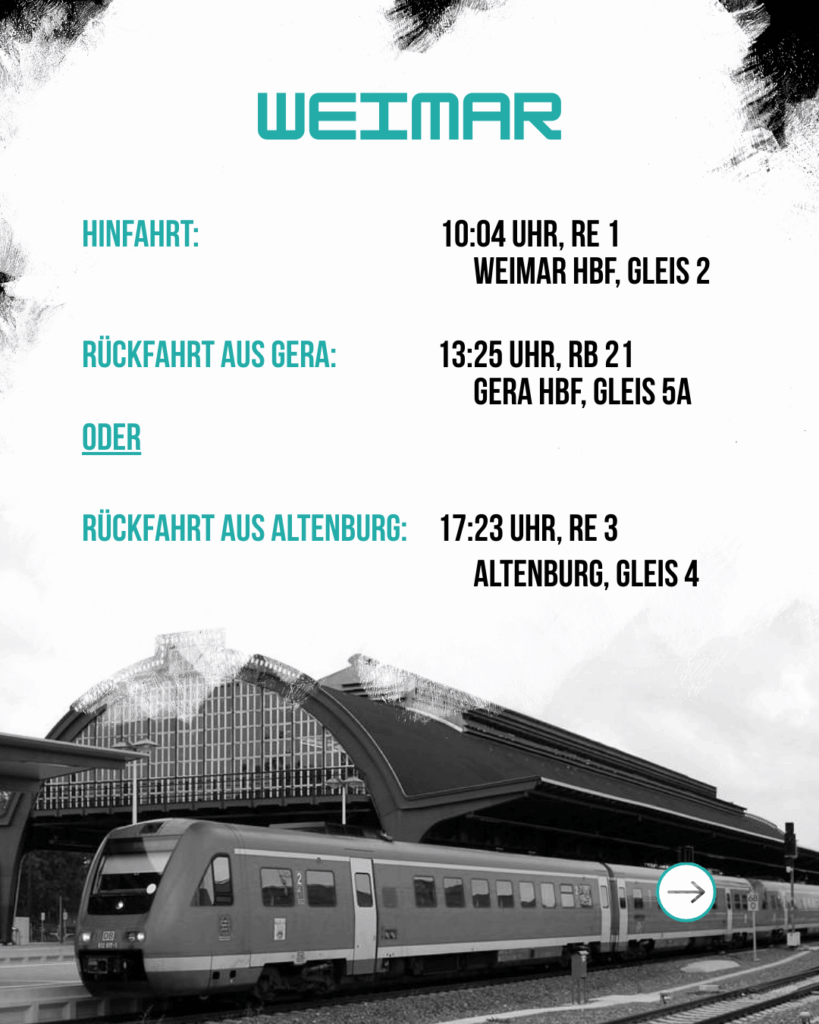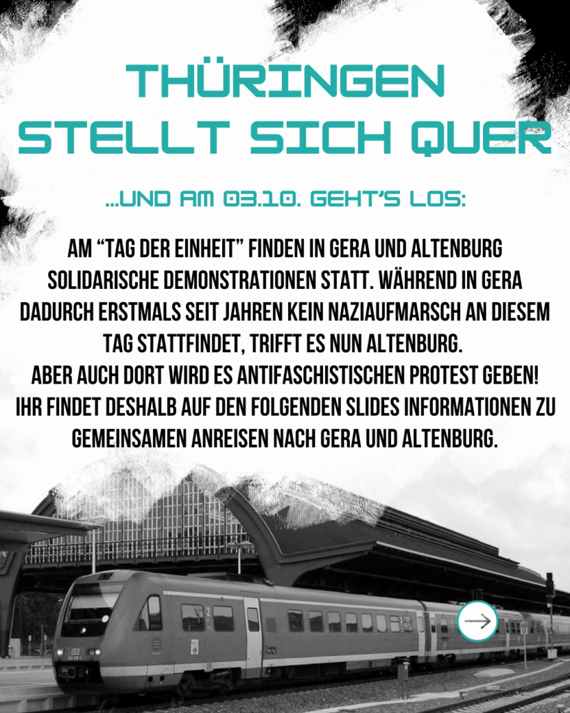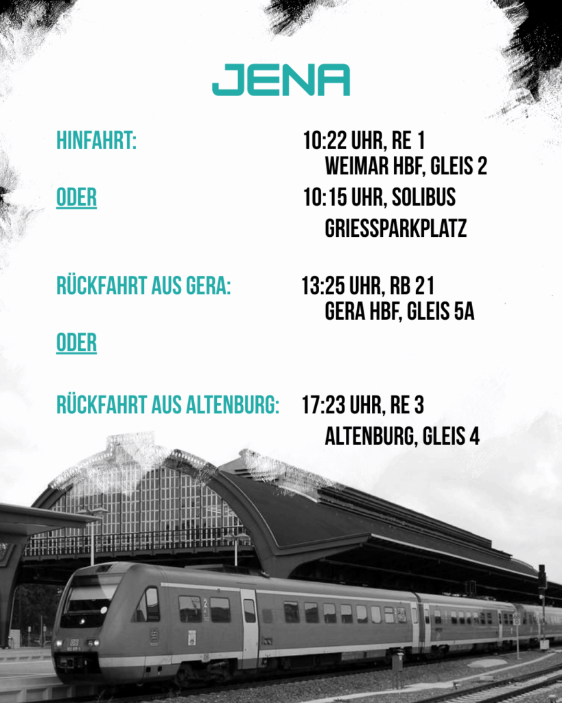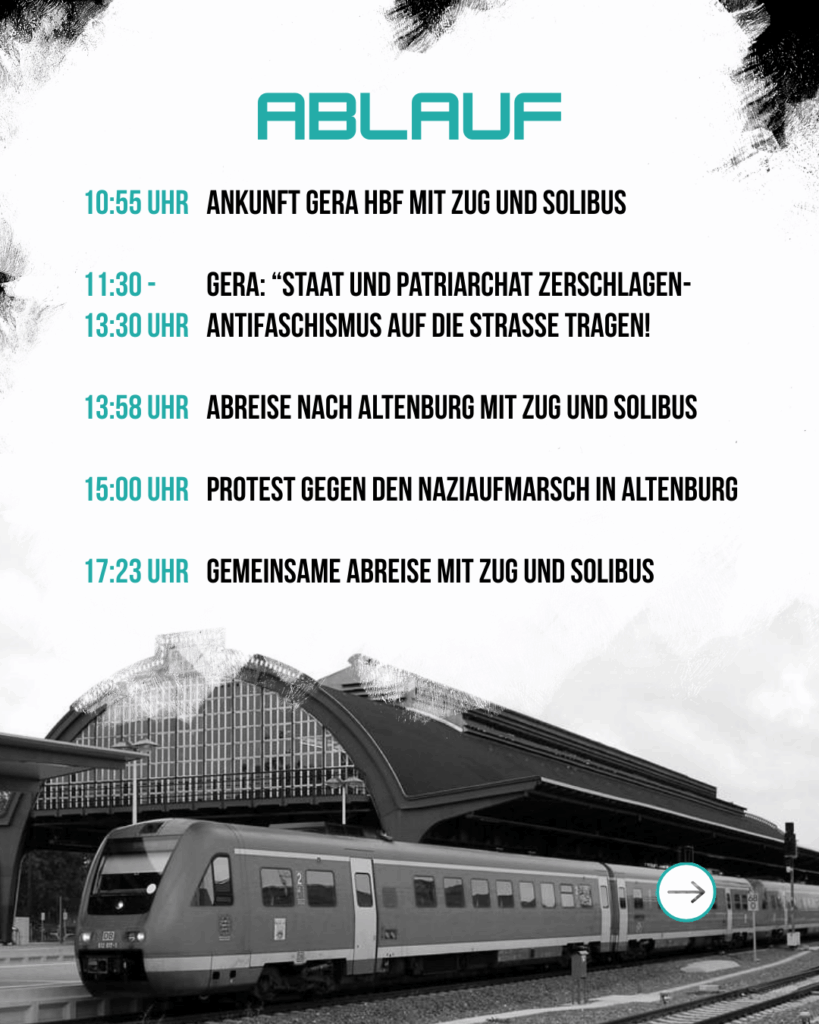 Im Anschluss an die Demo in Gera fahren wir mit Zug und Solibus nach Altenburg zur dortigen Demo gegen den rechtsextremen Aufmarsch. Von dort wiederum geht’s mit Zug in Richtung Erfurt, Weimar und Jena – wer möchte, hat auch hier die Möglichkeit, bis Jena mit dem Solibus zu fahren.