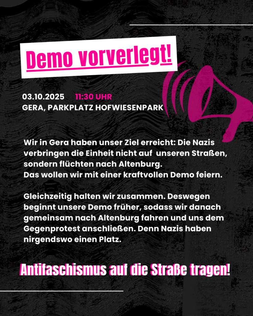 Gleichzeitig dürfen die Genoss*innen in Altenburg nicht mit dem rechten Aufmarsch alleine gelassen werden, weshalb wir unsere Demo vorziehen und verkürzen werden, um 13.57 Uhr mit Zug und Solibus zur Demo in Altenburg aufzubrechen, welche um 15.00 Uhr beginnen wird.